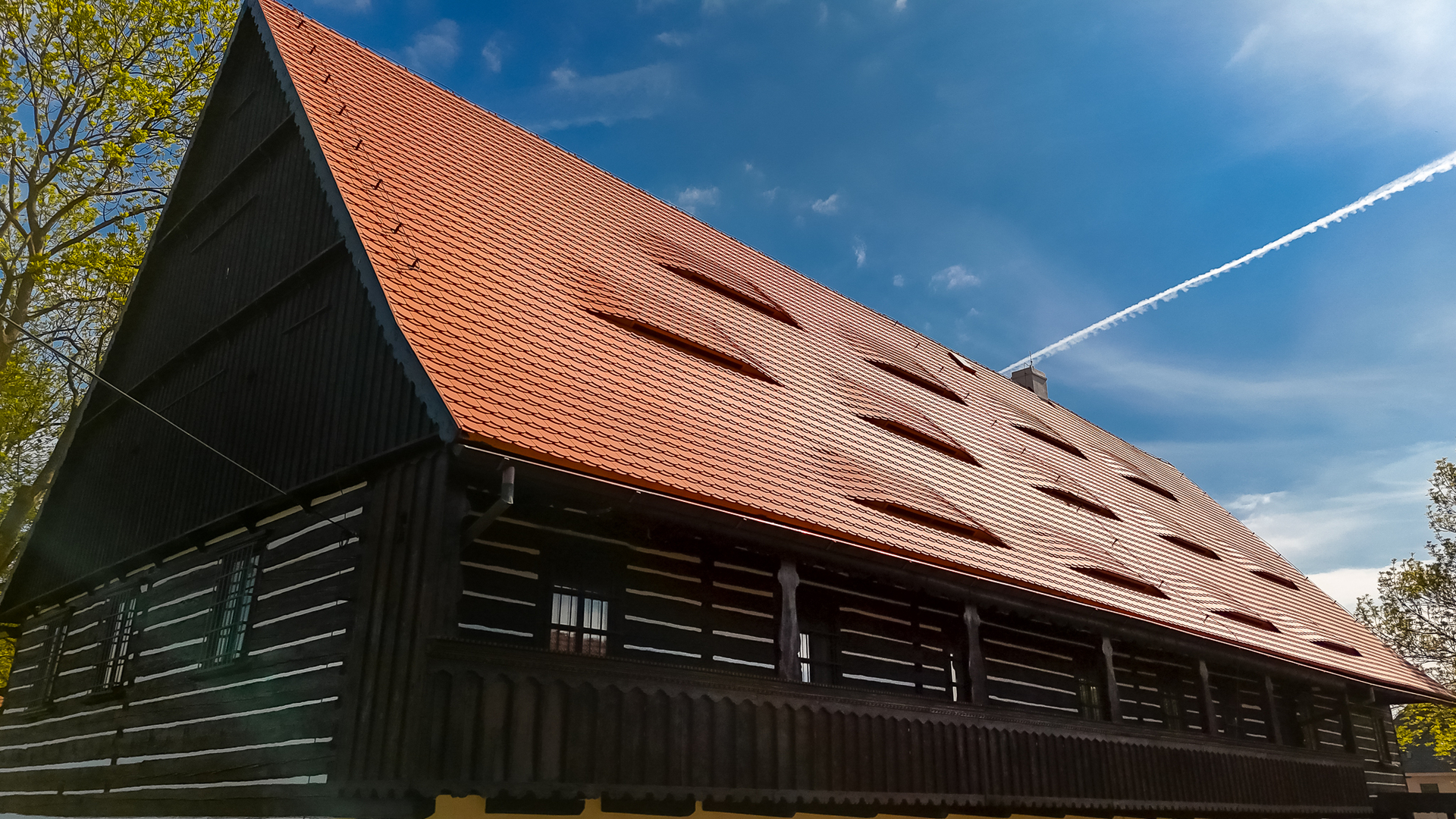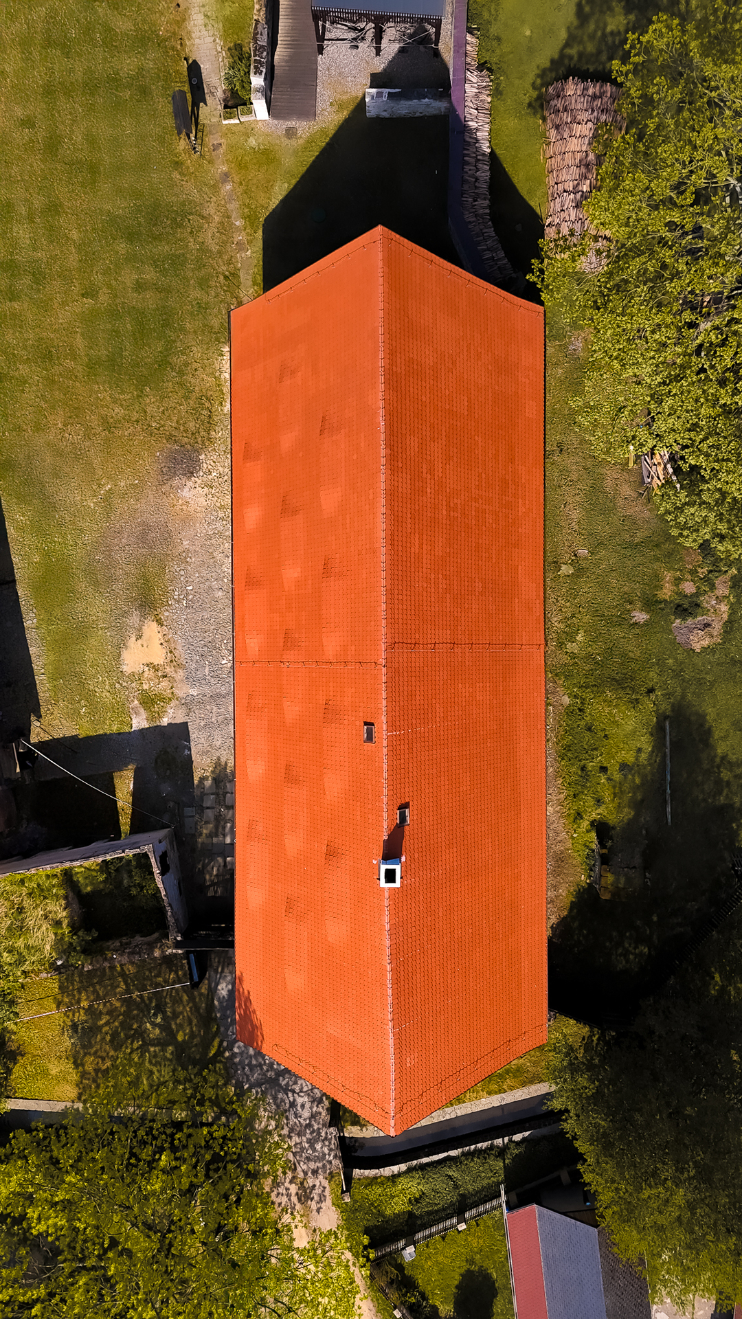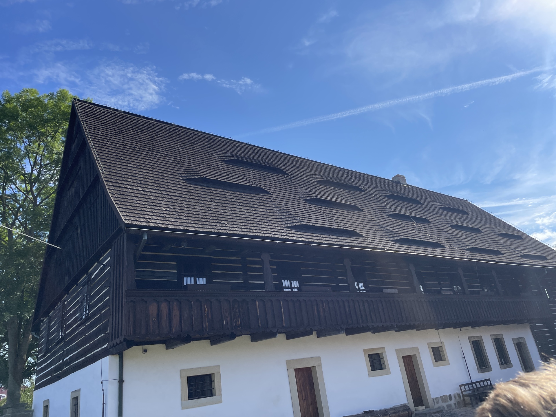 V rámci střešních prací jsme nejprve opravili staré krovy a doplnili pět nových střešních vazeb, které jsou zásadní pro stabilitu celé konstrukce. Poté jsme odstranili původní dřevěné šindele a nahradili je novou krytinou z bobrovky – tradičního a mimořádně odolného materiálu, který citlivě navazuje na původní vzhled objektu.