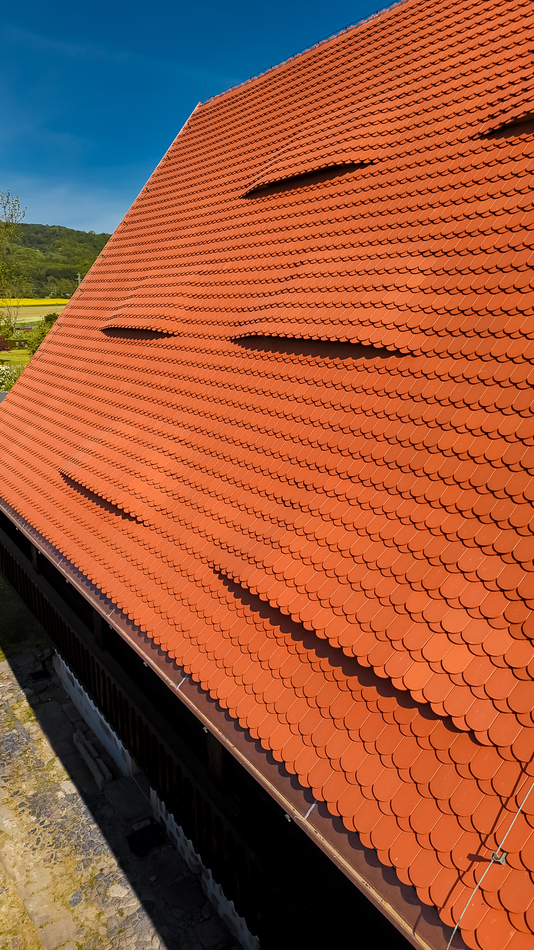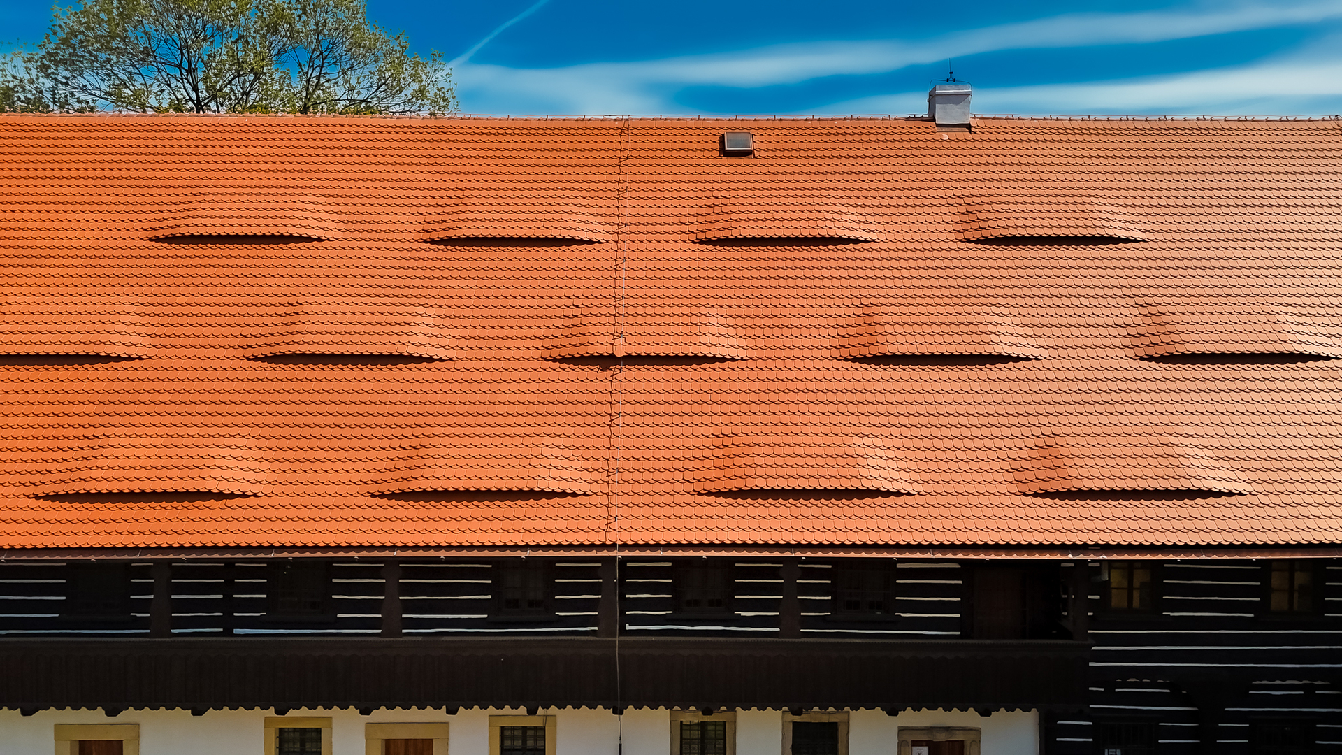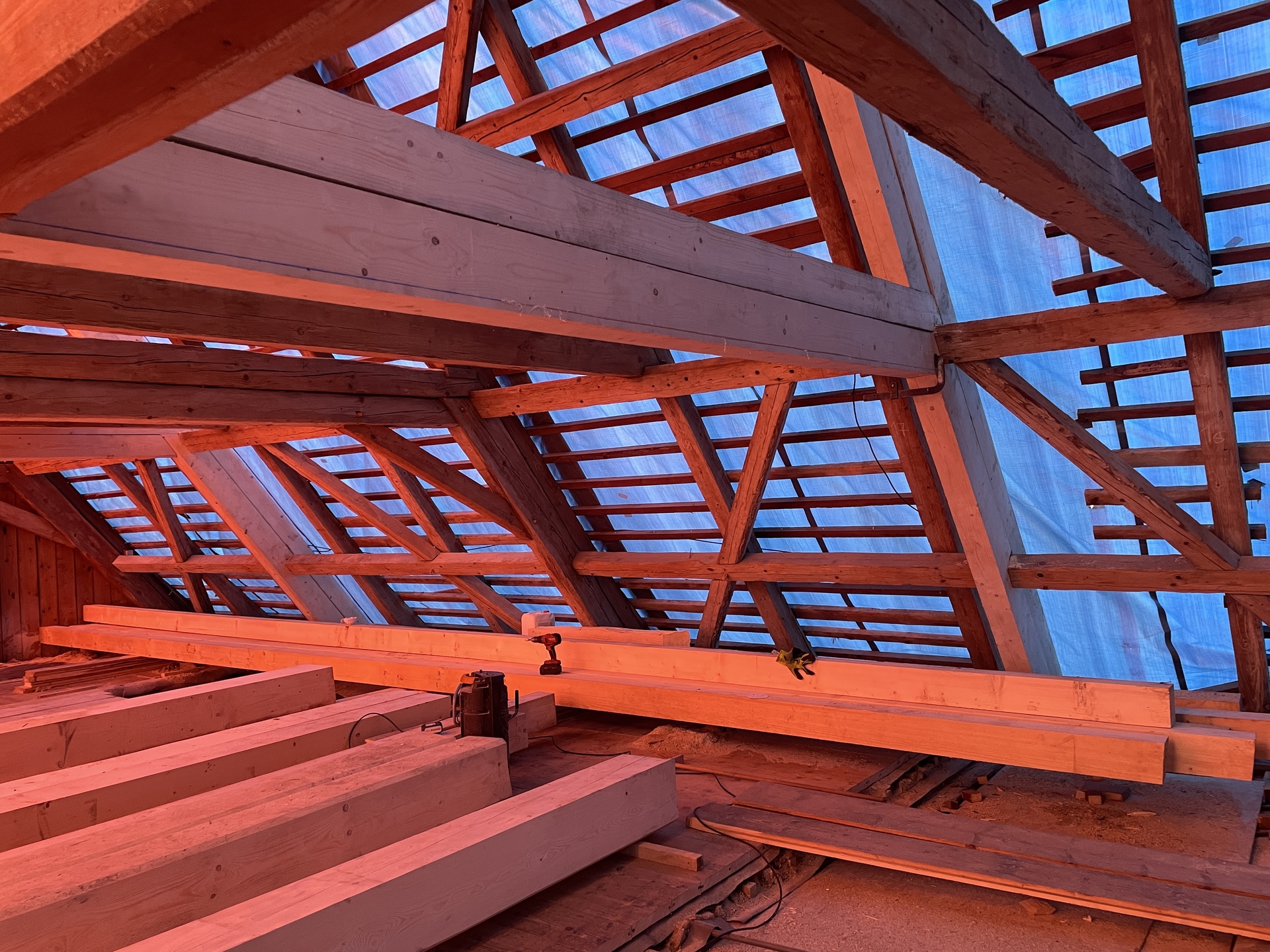 V rámci střešních prací jsme nejprve opravili staré krovy a doplnili pět nových střešních vazeb, které jsou zásadní pro stabilitu celé konstrukce. Poté jsme odstranili původní dřevěné šindele a nahradili je novou krytinou z bobrovky – tradičního a mimořádně odolného materiálu, který citlivě navazuje na původní vzhled objektu.