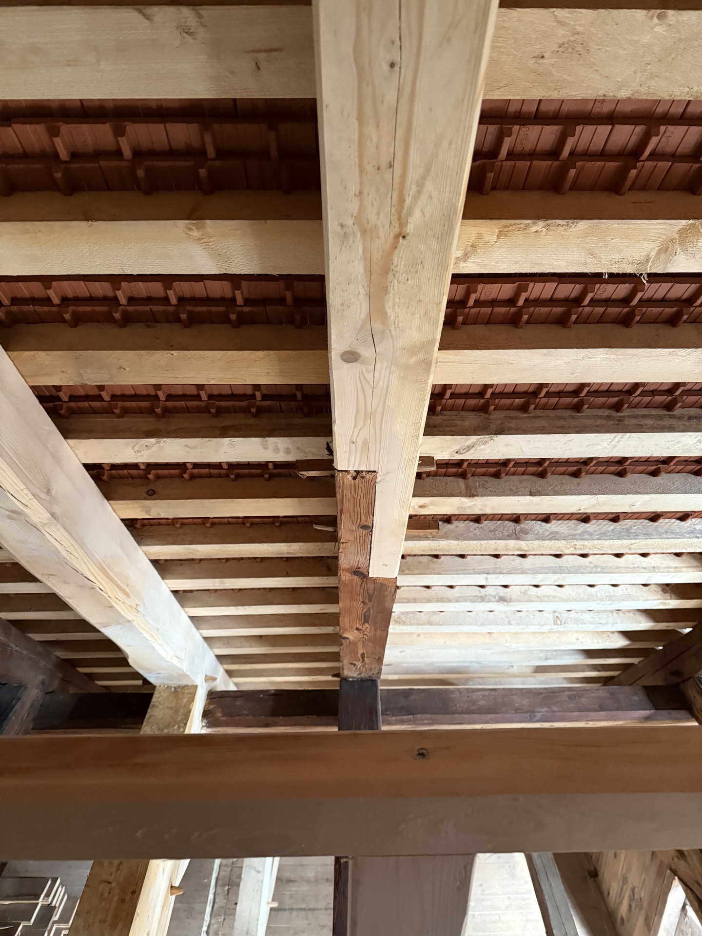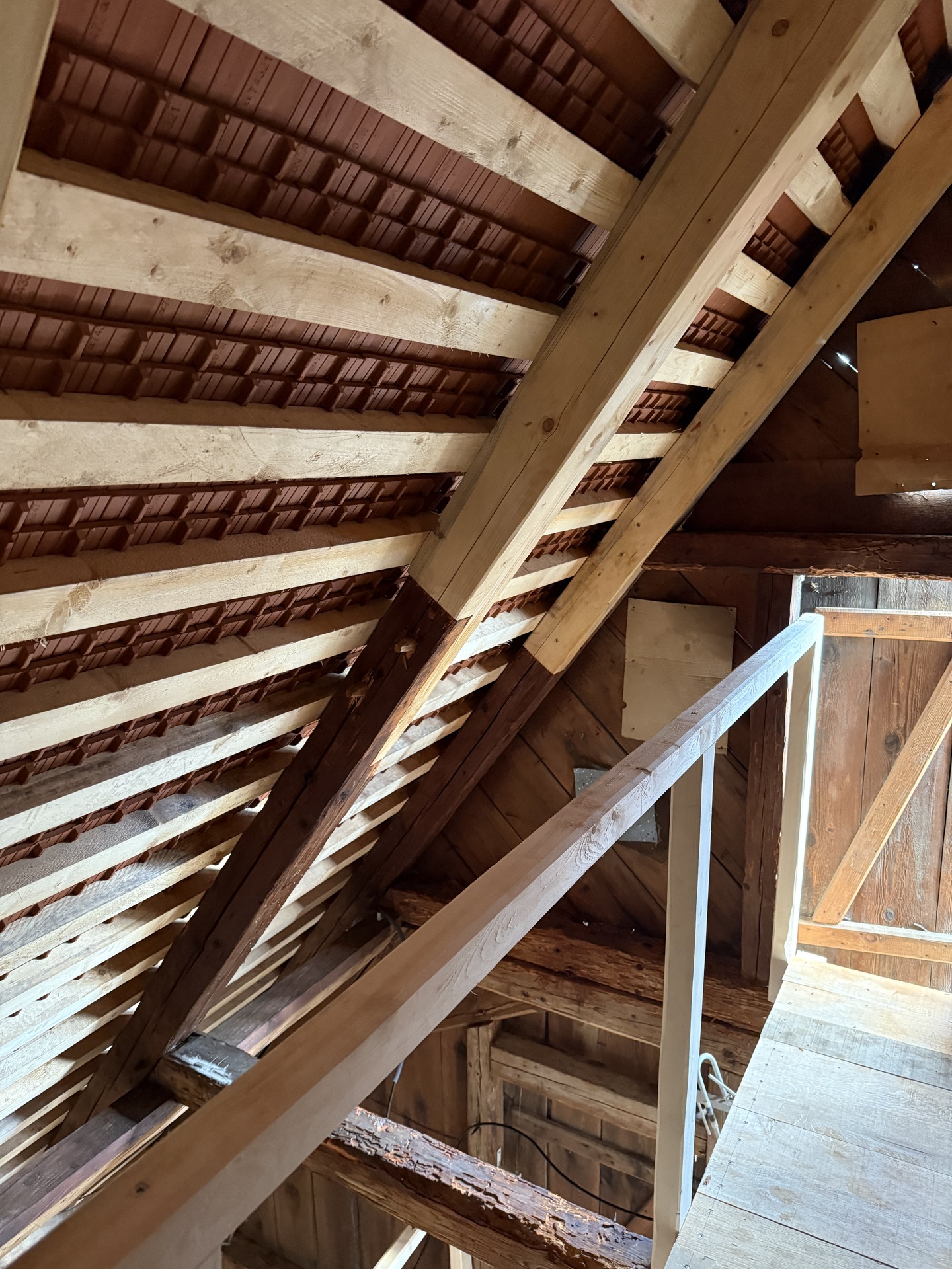 Dále jsme provedli nové výmazávky spár roubené části stavby, které byly pečlivě zhotoveny v souladu s historickými postupy a materiály, aby byla zachována autenticita konstrukce a zároveň zajištěna její ochrana.