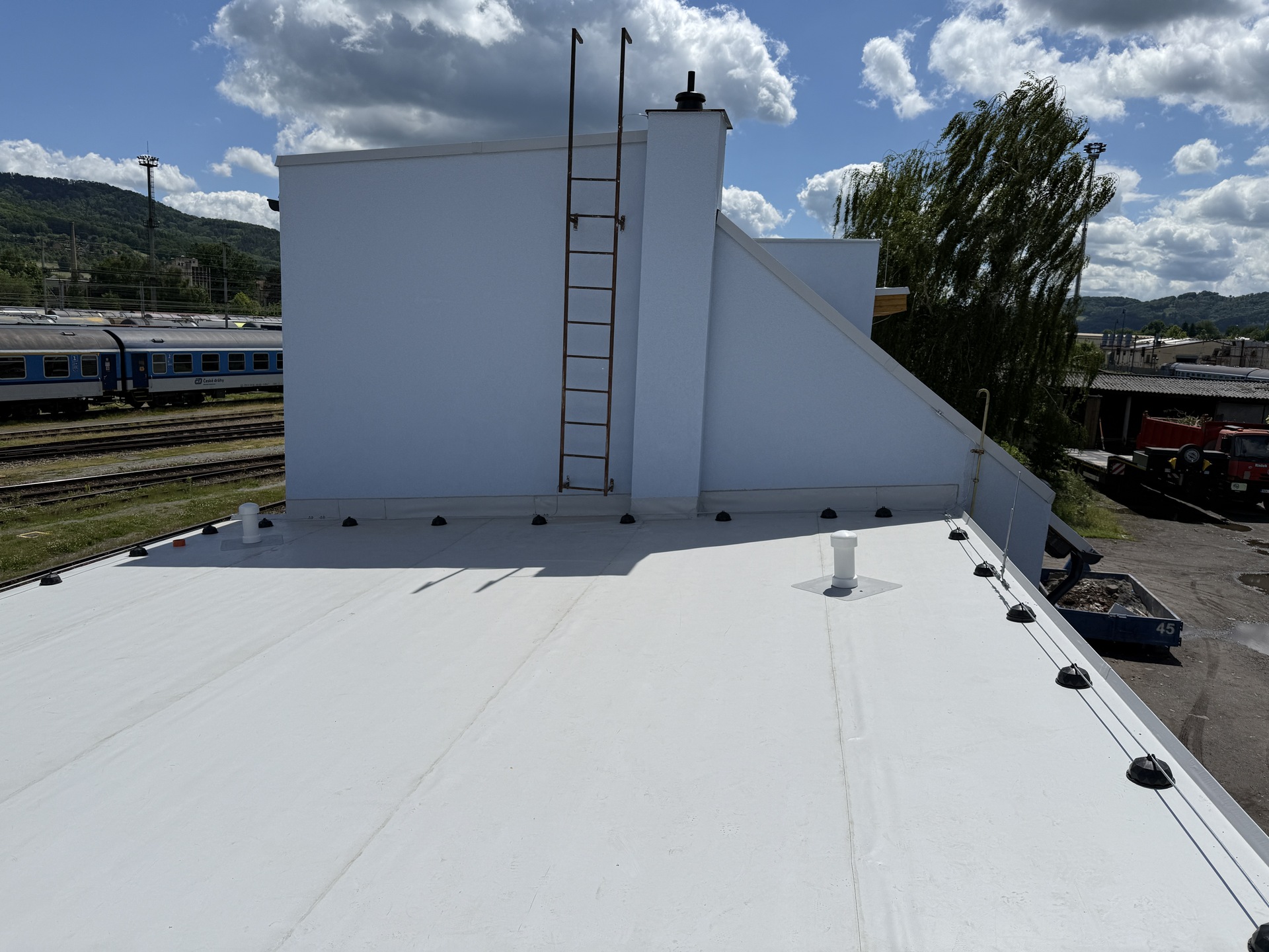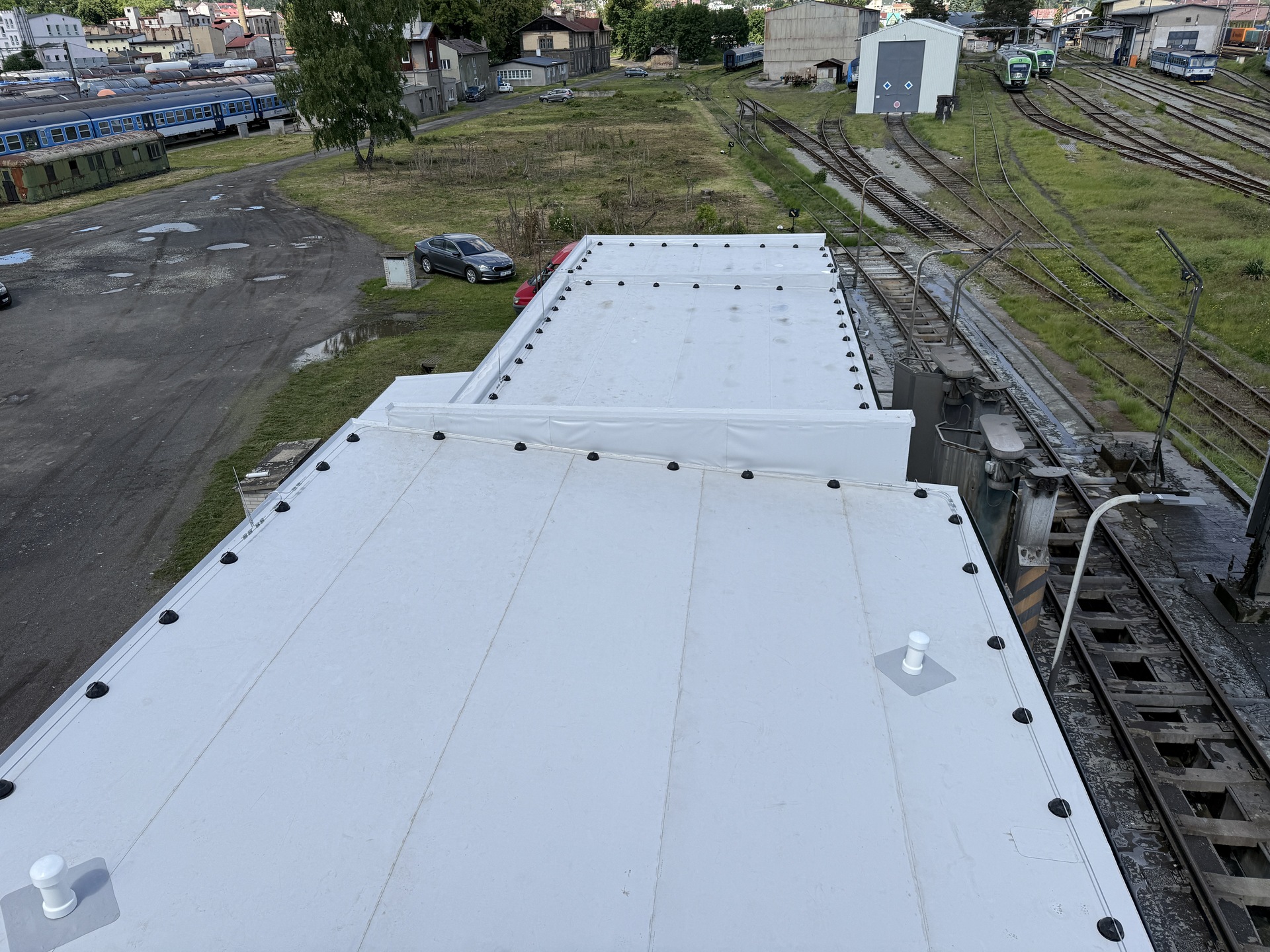 Při rekonstrukci objektu myčky vlaků v Děčíně jsme provedli kompletní opravu fasády a výměnu střešní krytiny, abychom zlepšili technický stav budovy a prodloužili její životnost.