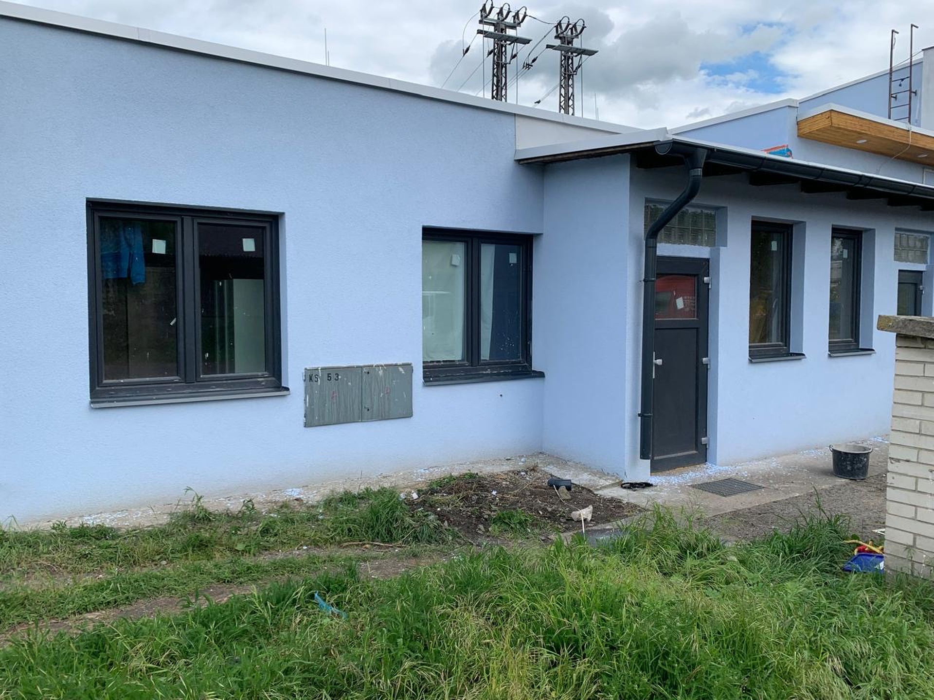Současně jsme provedli opravu fasády, která zahrnovala očištění původního povrchu, aplikaci lepidla s výztužnou perlinkou a finální úpravu silikonovou omítkou. Tento postup zajistil nejen esteticky jednotný vzhled celé budovy, ale také vysokou odolnost proti vlhkosti a znečištění, které jsou v prostředí železničního provozu častým problémem.