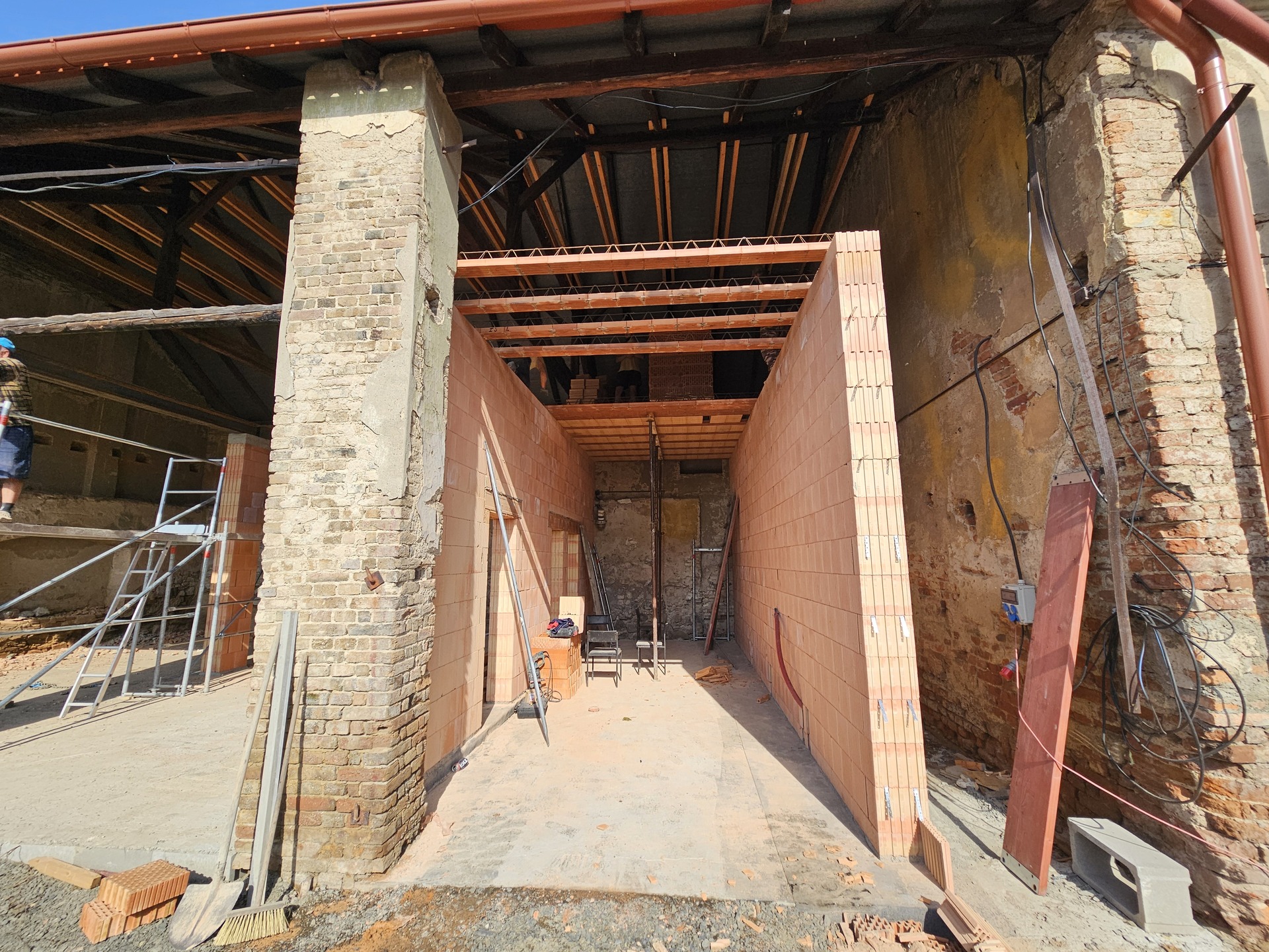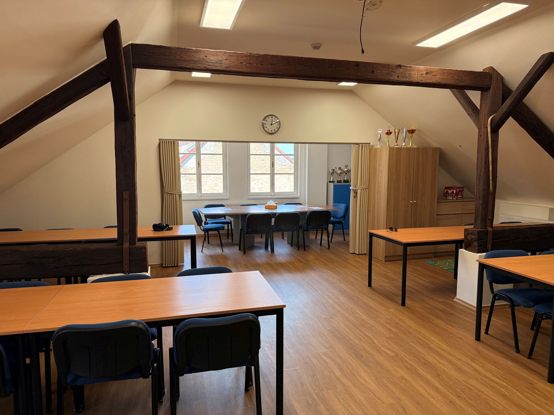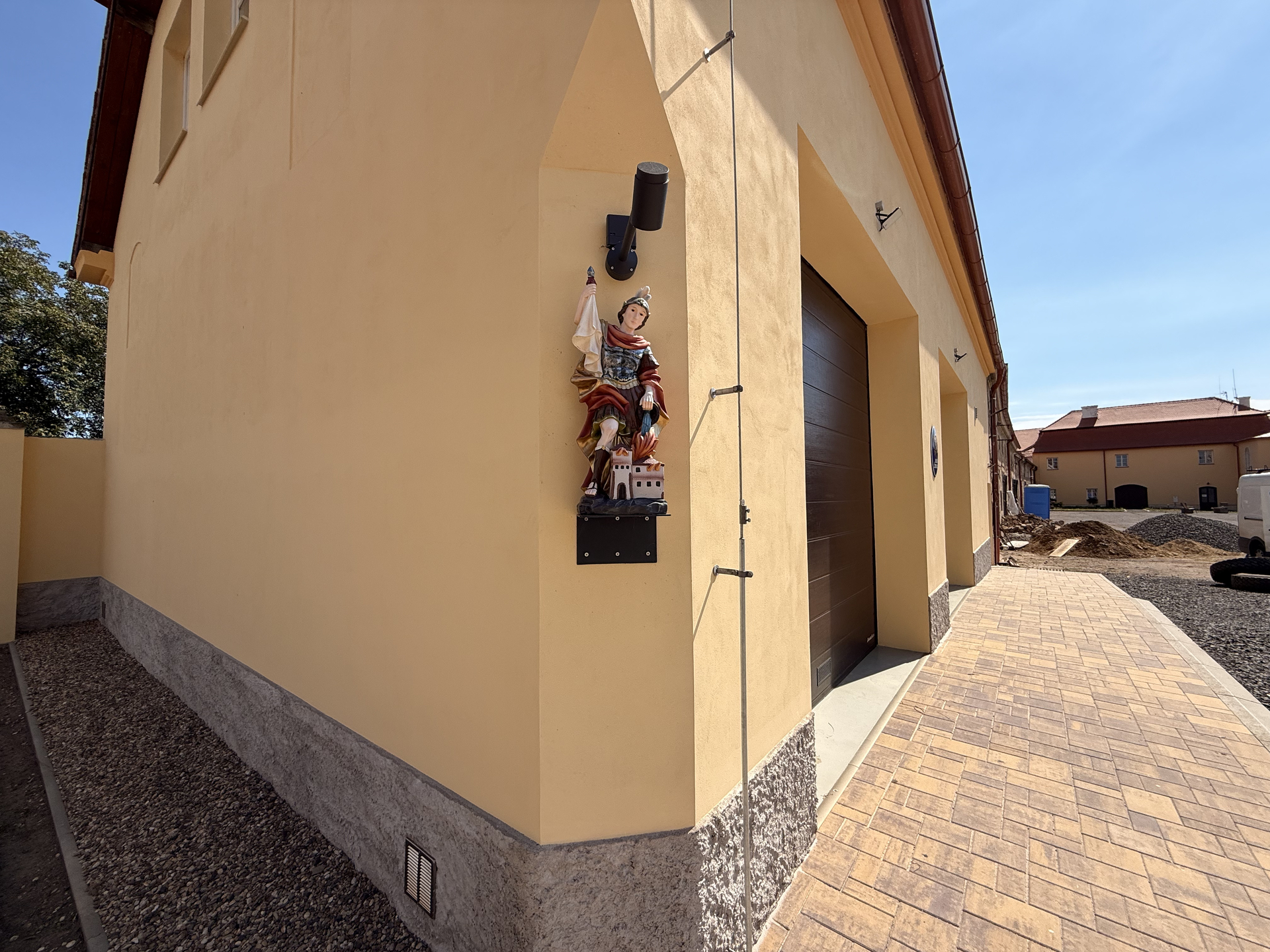 Stavební úpravy severní části severovýchodního křídla zámku Lukavec přinesly vybudování nové hasičské zbrojnice pro jednotku SDH Lukavec. V přízemí vznikla garáž pro požární techniku, šatny, umývárna a technické místnosti, v patře pak denní místnost s kuchyňkou, sociální zařízení a kancelář velitele. Konstrukčně byly provedeny nové příčky, podlahy s izolacemi a keramobetonové stropy, pod střechou pak sádrokartonový podhled s tepelnou izolací. Fasáda byla sjednocena v pískových a oranžových odstínech, střecha pokryta pálenou bobrovkou a osazena nová dřevěná okna a dveře. Objekt byl napojen na vodovod, kanalizaci, elektřinu a plyn, vytápění zajišťuje plynový kotel. Realizace poskytla hasičům moderní, funkční a reprezentativní zázemí, které zároveň citlivě respektuje historický charakter zámku.