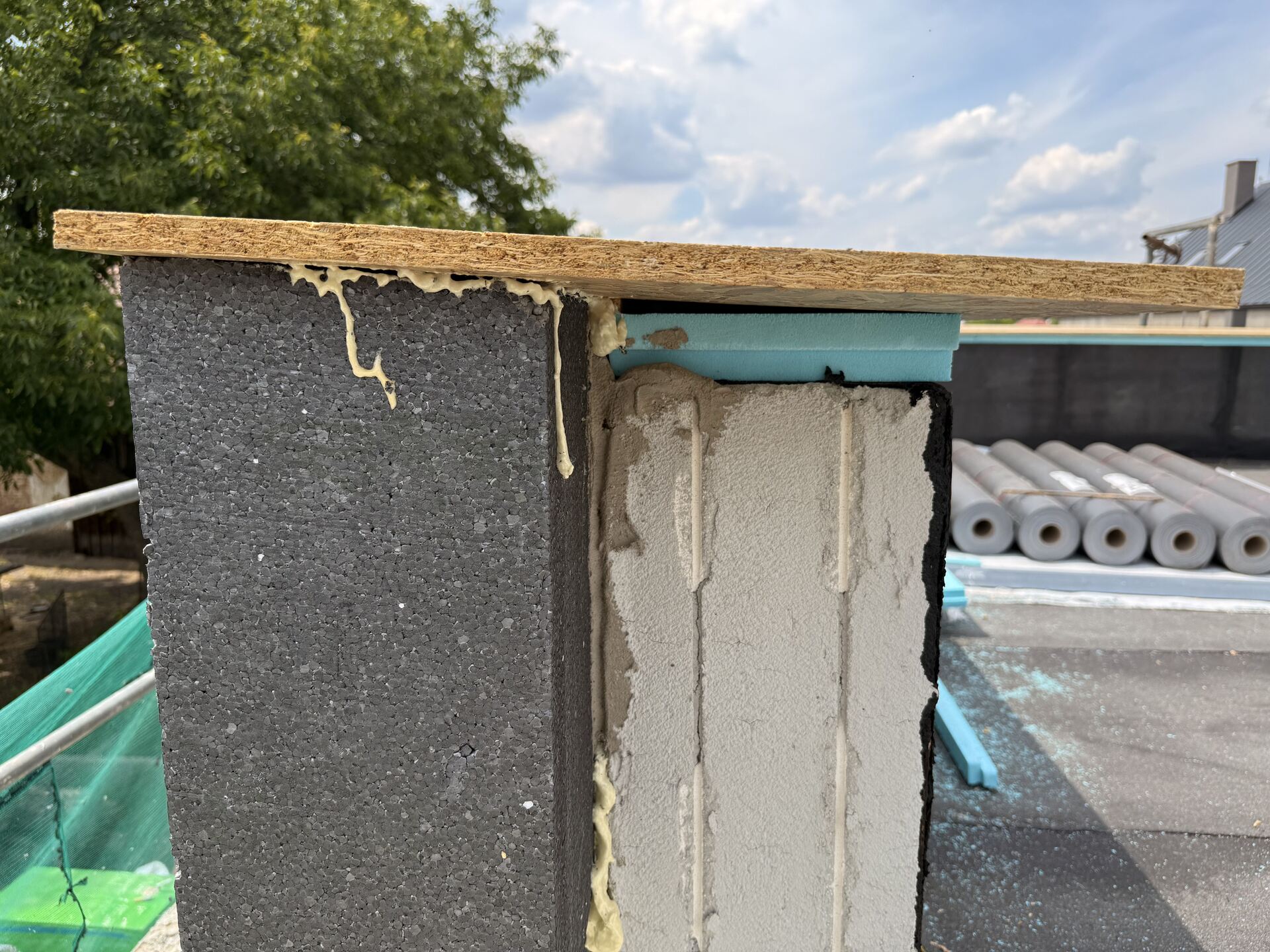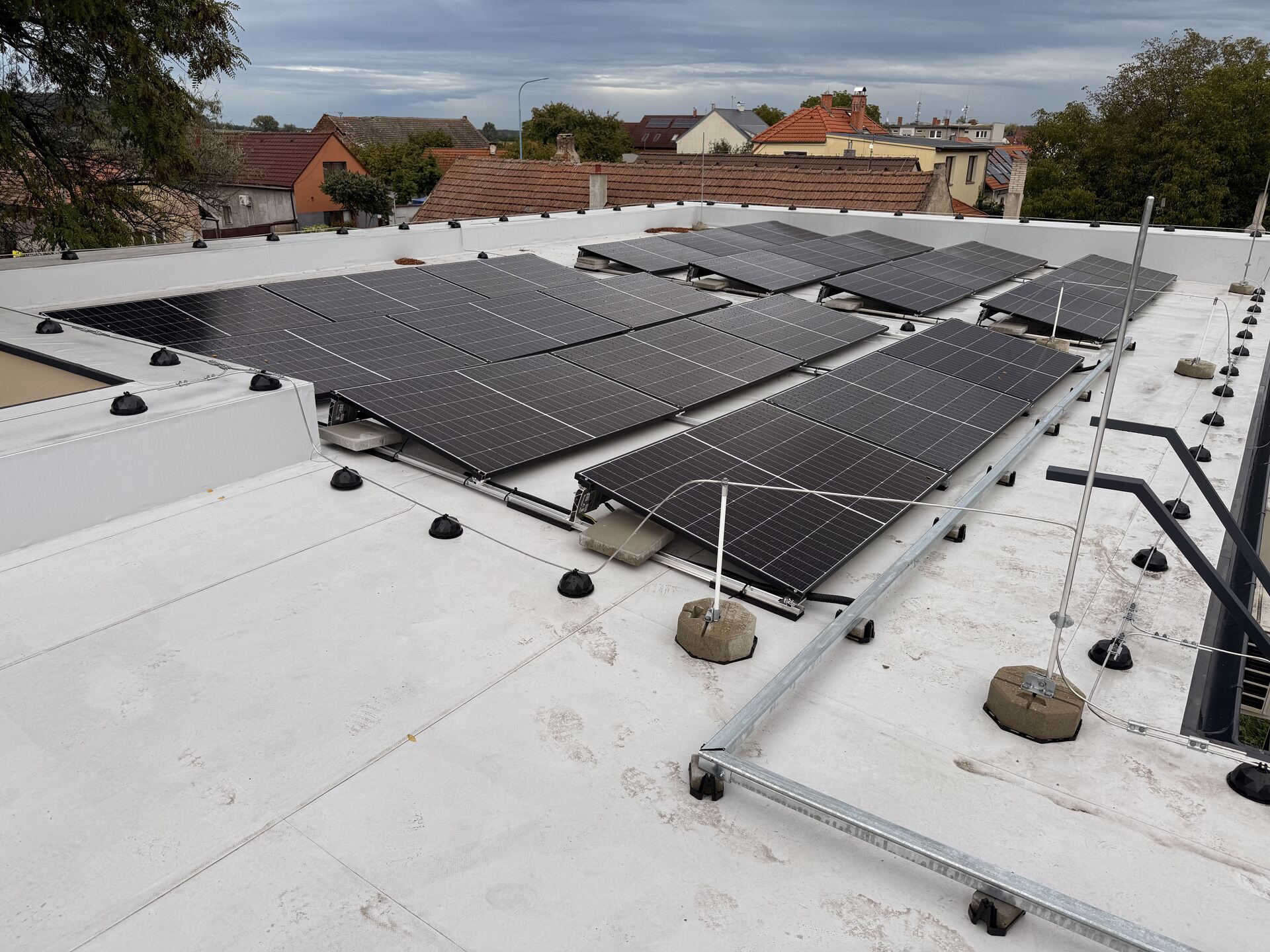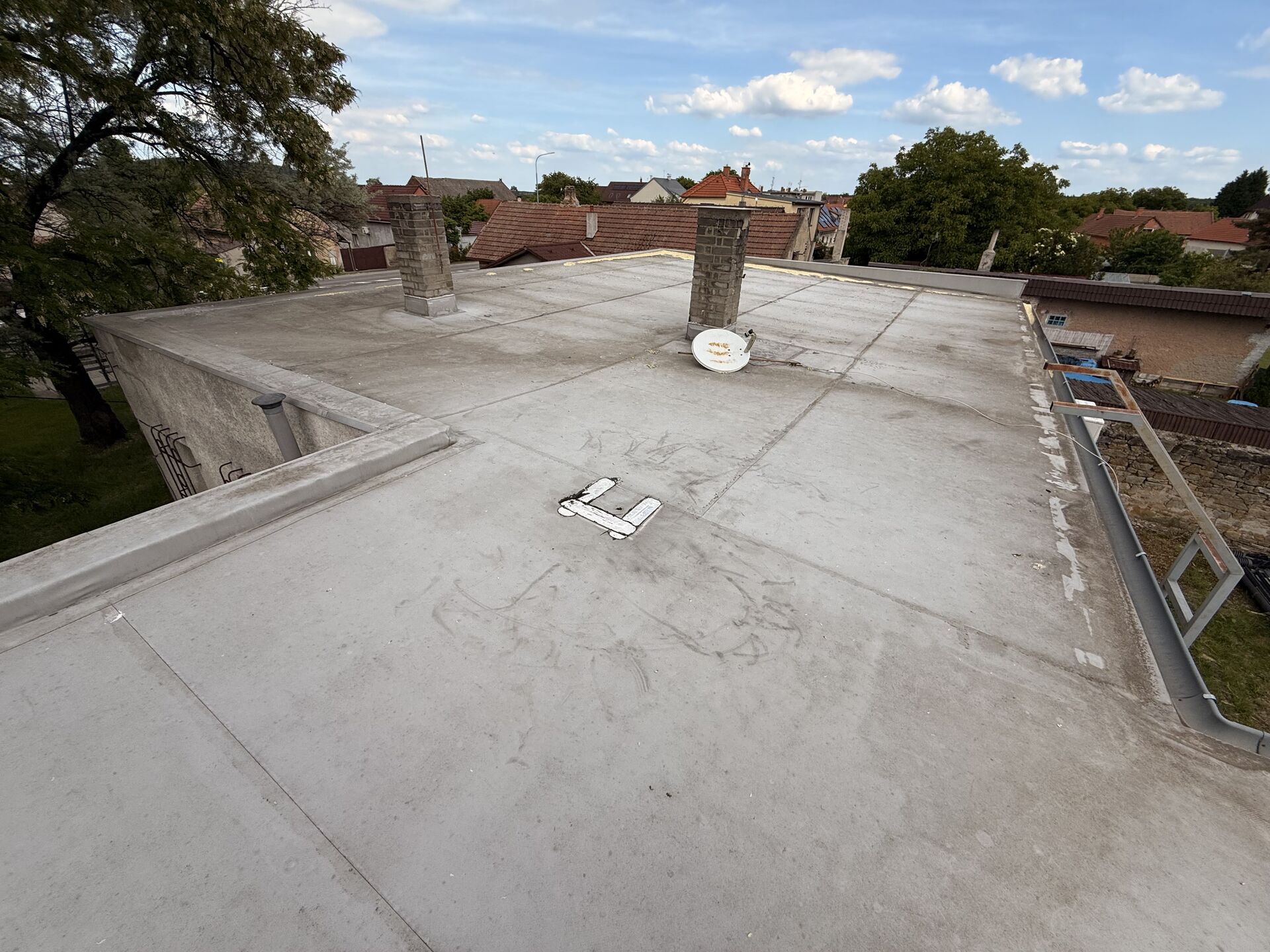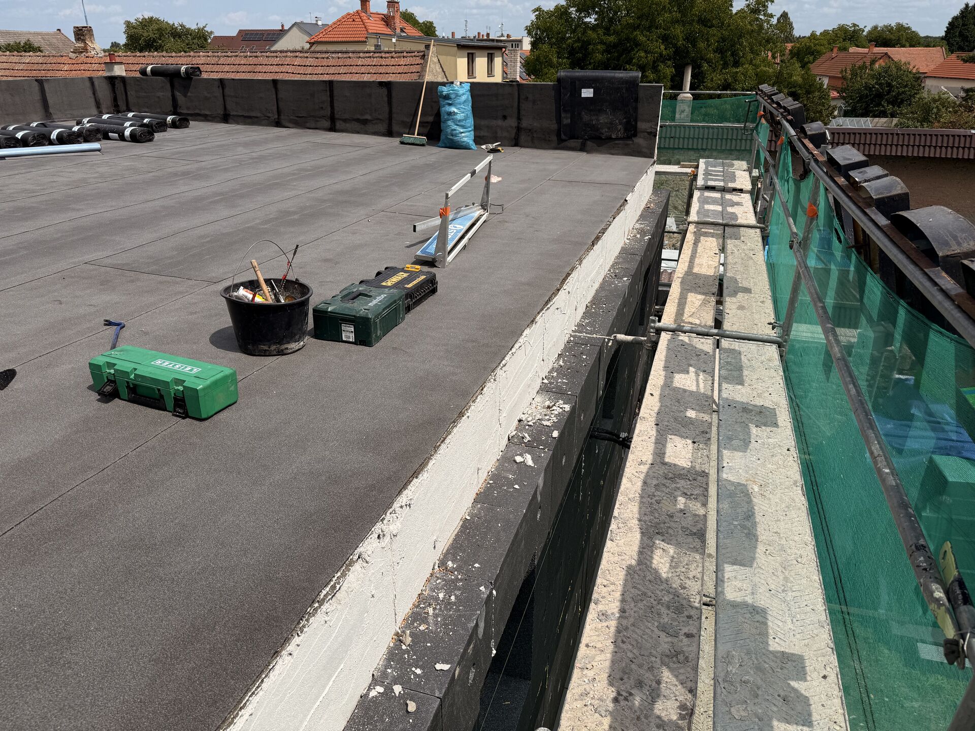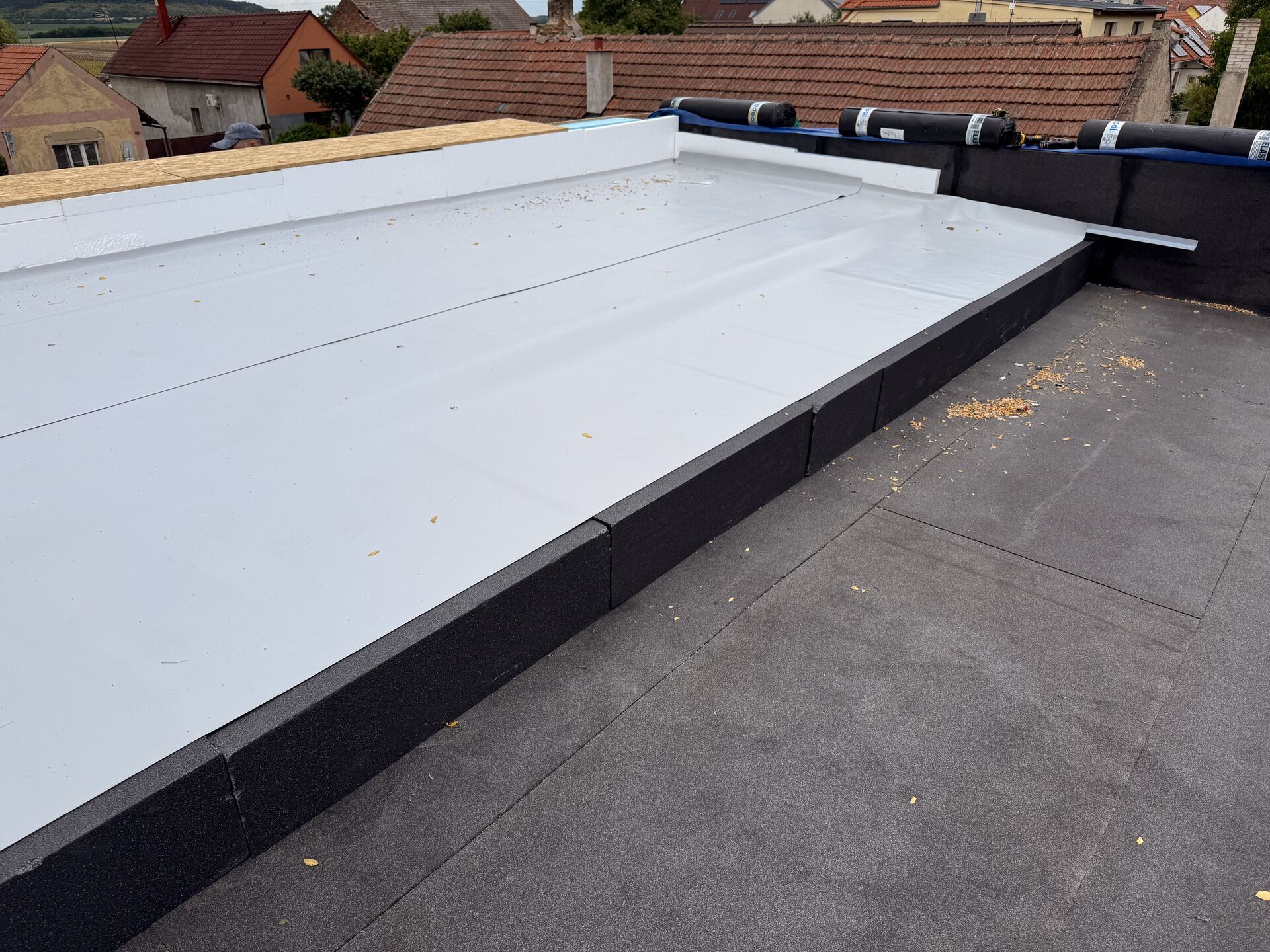 Současně bylo navrženo a provedeno dodatečné zateplení ploché střechy. Stávající skladba je doplněna tepelnou izolací z EPS v kombinaci několika tlouštěk tak, aby bylo dosaženo požadovaného součinitele prostupu tepla a eliminovány tepelné mosty v oblasti atik a napojení na obvodové zdivo. Na izolační vrstvy navazuje střešní fólie z PVC, která zajišťuje spolehlivou vodotěsnost a dlouhou životnost střechy při minimálních nárocích na údržbu. V rámci přípravy na budoucí technologie jsou ve střeše řešeny i prostupy pro možnou instalaci fotovoltaiky.